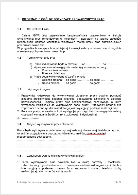 - Instrukcję Bezpiecznego Wykonania Robót (IBWR) - Praca w przestrzeniach zamkniętych w wersji edytowalnej pliku Word