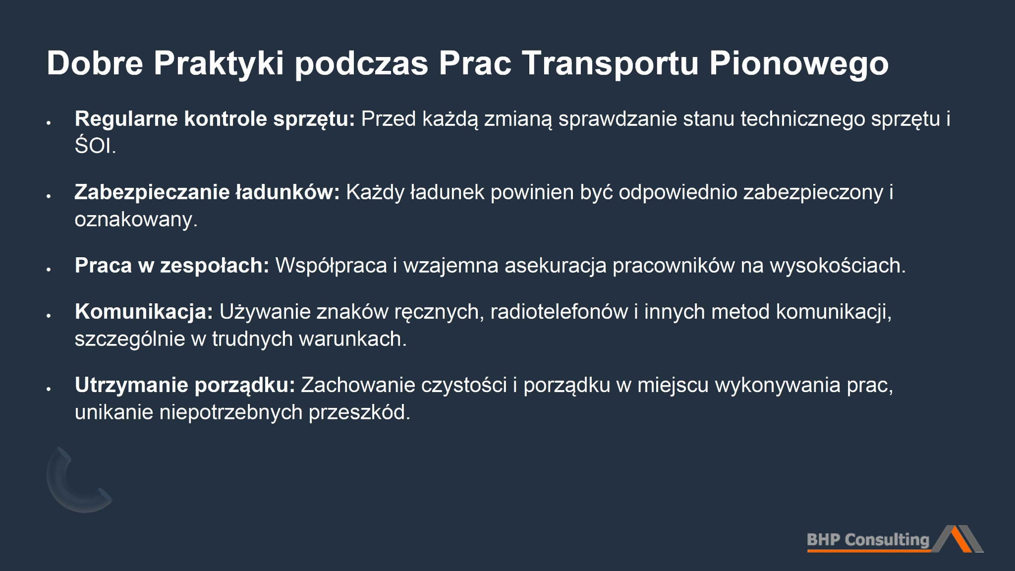 5. Dobre praktyki – rekomendacje dotyczące zasad pracy i komunikacji podczas transportu pionowego, takie jak regularne kontrole sprzętu i zabezpieczanie ładunków.
