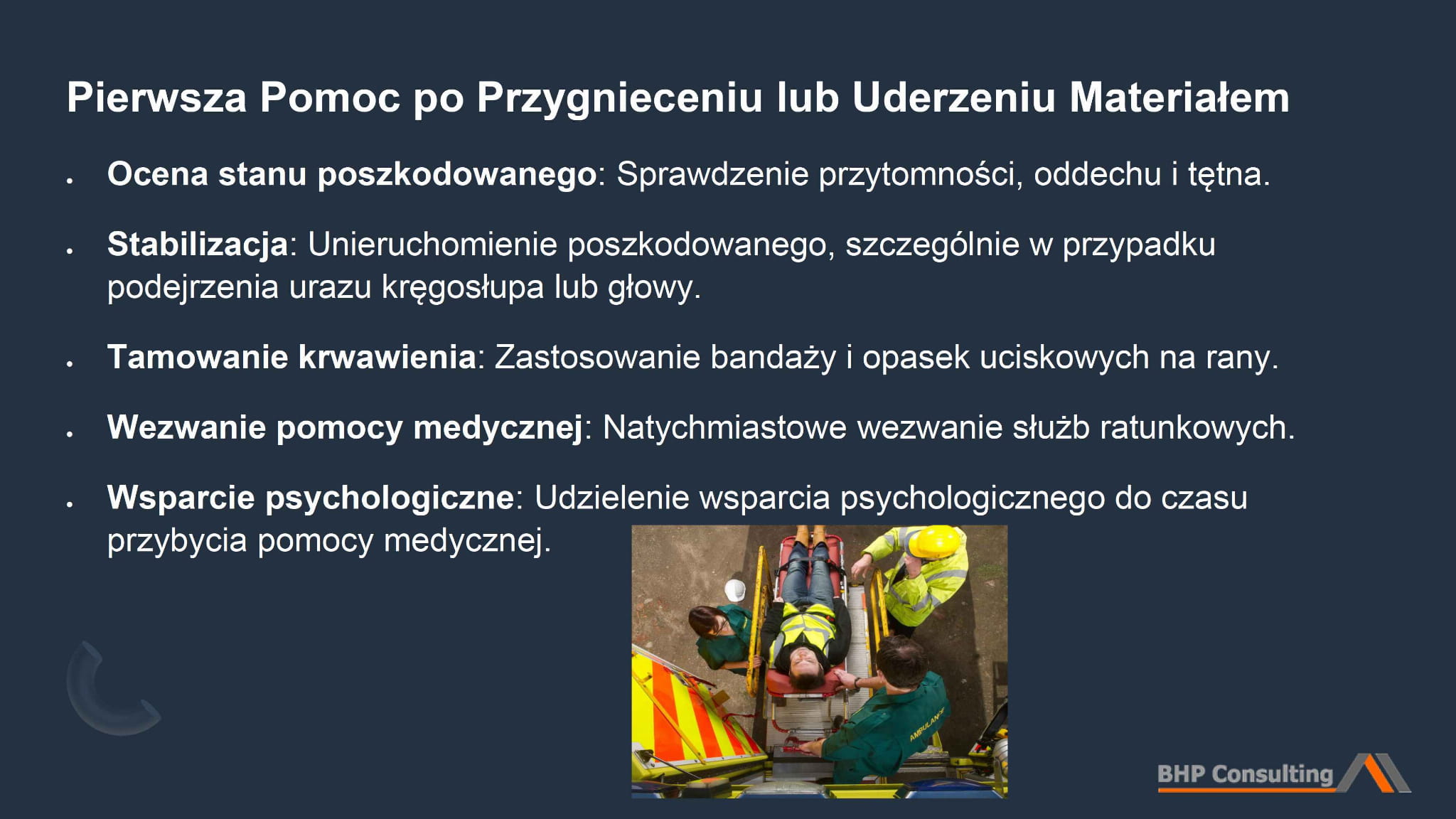 6. Procedury pierwszej pomocy – szczegółowe kroki udzielania pomocy w przypadku wypadków, w tym przy upadkach z wysokości, przygnieceniu oraz porażeniu prądem.