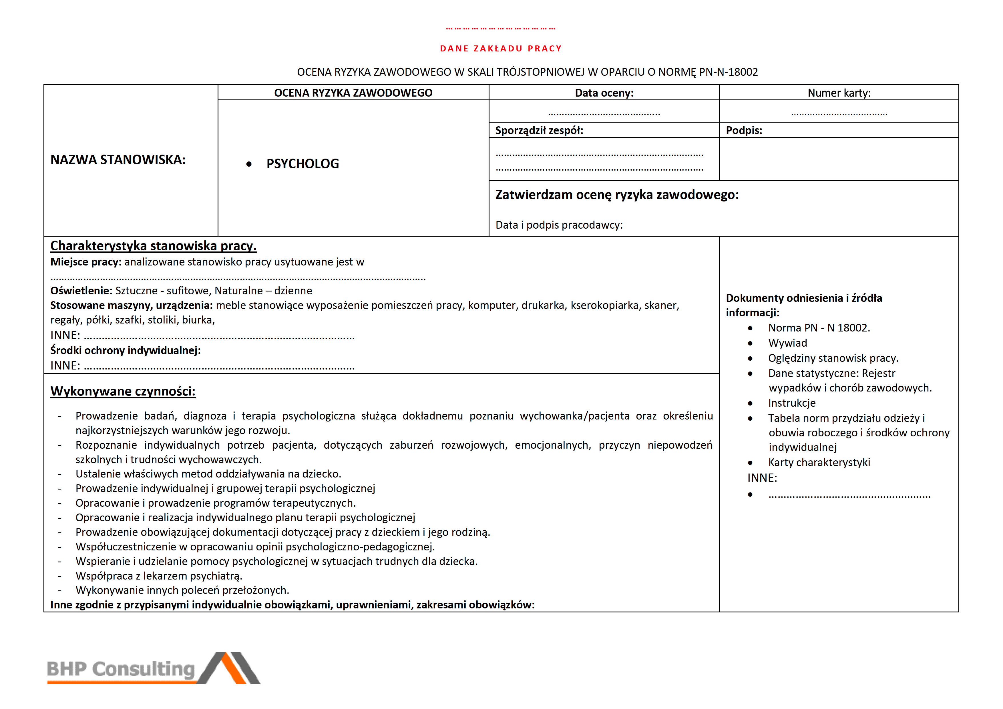 Ocena ryzyka zawodowego – Psycholog | Dokumentacja BHP