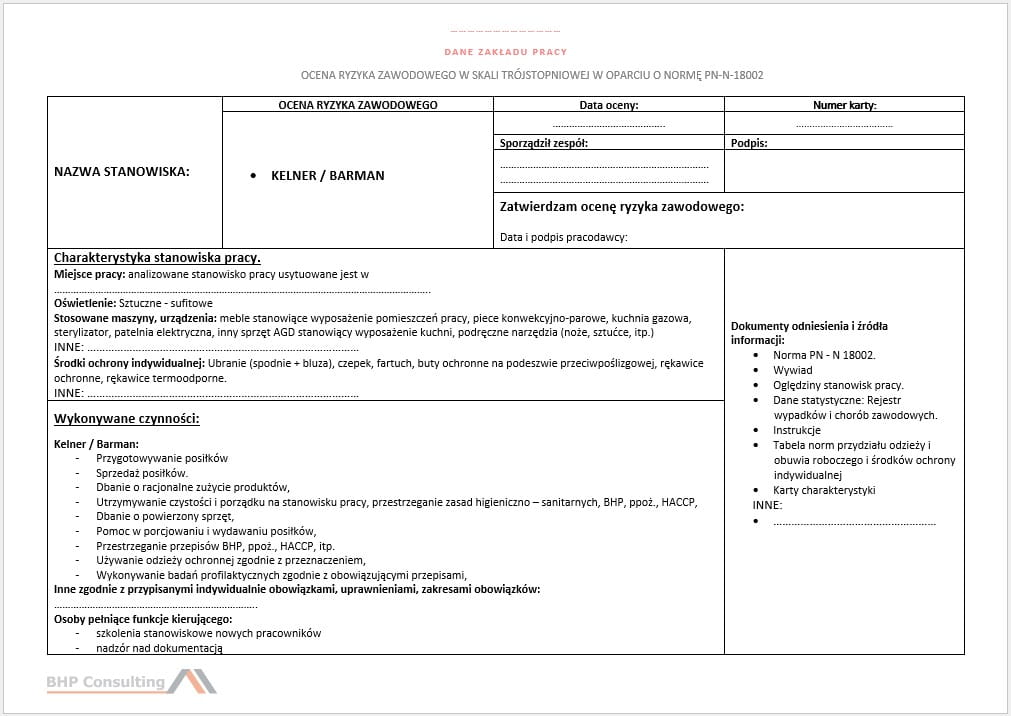 - Karta oceny ryzyka zawodowego na stanowisku barman / kelner w wersji edytowalnej pliku Word