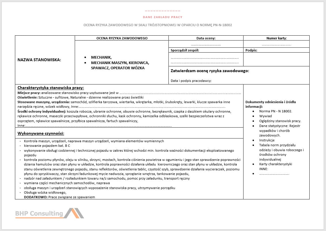 Masz do dyspozycji 13 kart oceny ryzyka zawodowego wg normy PN-N 18002 na stanowisku: