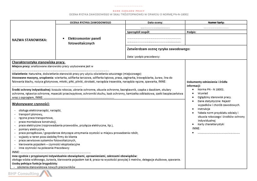 Karta oceny ryzyka zawodowego na stanowisku elektromonter paneli fotowoltaicznych + możliwość konsultacji ze specjalistą ds. BHP