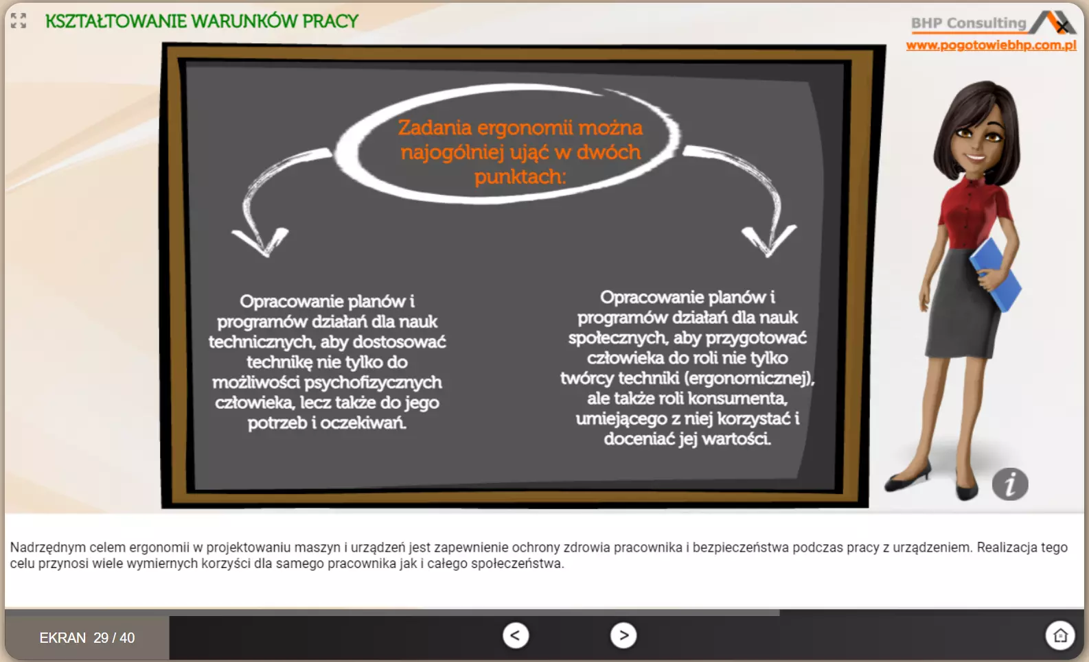 - duża skuteczność w przekazywaniu wiedzy - część merytoryczną szkoleń BHP online opracowali specjaliści BHP z wieloletnim stażem pracy; jeżeli dany temat interesuje Cię bardziej, zawsze masz możliwość poszerzenia wiedzy - poza slajdami udostępniamy dodatkowe informacje oraz najważniejsze akty prawne