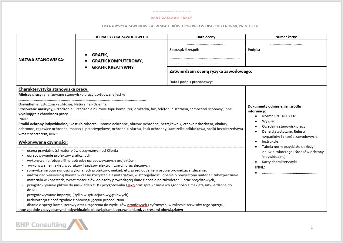 - Karta oceny ryzyka zawodowego na stanowisku grafik, grafik komputerowy, grafik kreatywny w wersji edytowalnej pliku Word