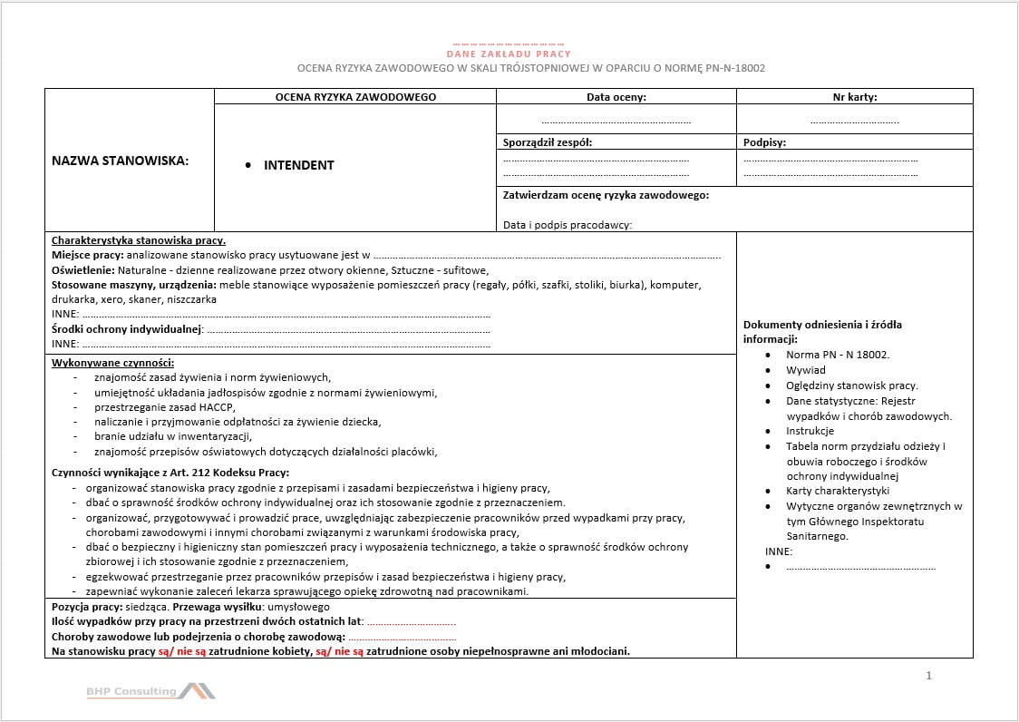Karta oceny ryzyka zawodowego na stanowisku intendent + możliwość konsultacji ze specjalistą ds. BHP