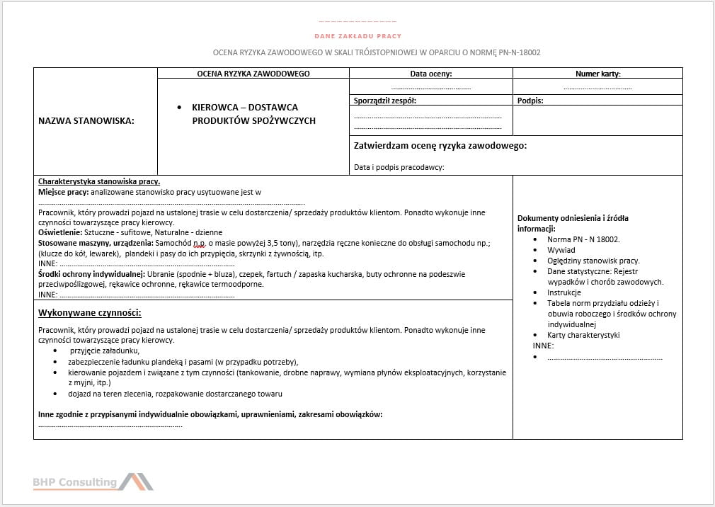 Karta oceny ryzyka zawodowego na stanowisku kierowca - dostawca produktów spożywczych + możliwość konsultacji ze specjalistą ds. BHP