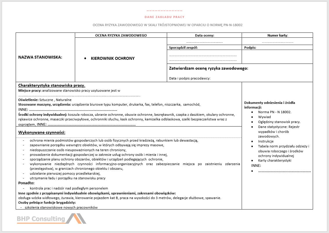 - Karta oceny ryzyka zawodowego na stanowisku kierownik ochrony w wersji edytowalnej pliku Word