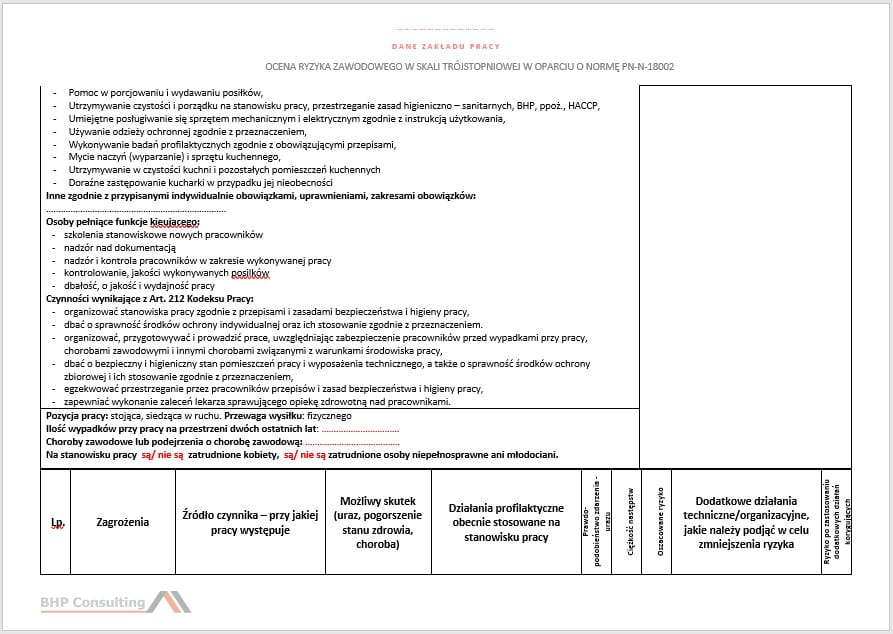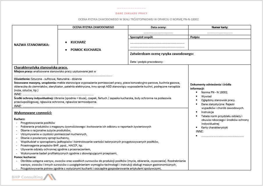 Karta oceny ryzyka zawodowego na stanowisku kucharz, pomoc kucharza + możliwość konsultacji ze specjalistą ds. BHP