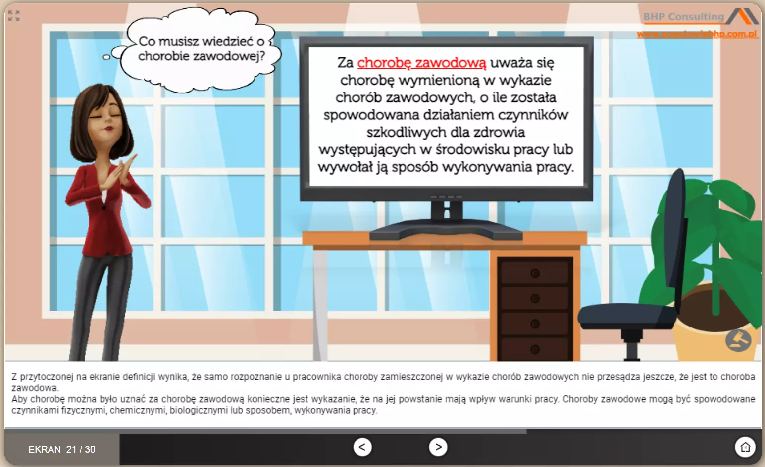 - Zrozumienie organizacji i metod kształtowania bezpiecznych i higienicznych warunków pracy, zarządzania bezpieczeństwem i higieną pracy, ze szczególnym uwzględnieniem stanowisk z monitorami ekranowymi.
