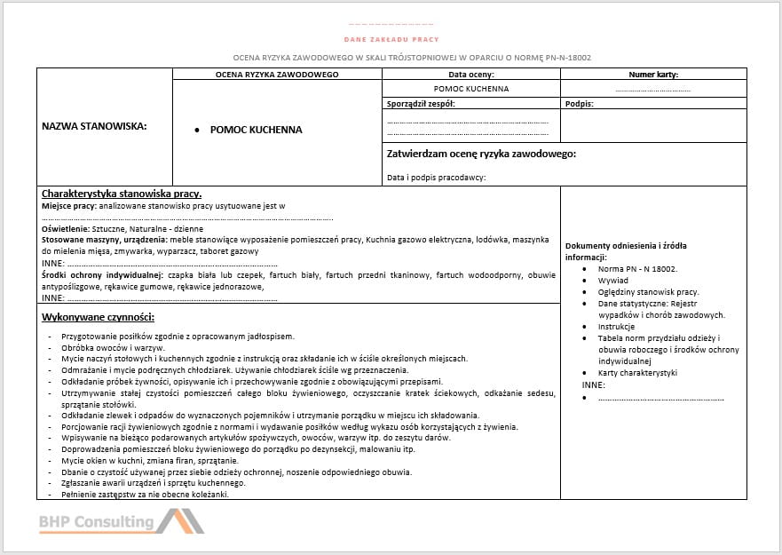 - Karta oceny ryzyka zawodowego na stanowisku pomoc kuchenna w wersji edytowalnej pliku Word
