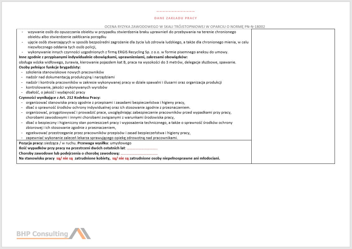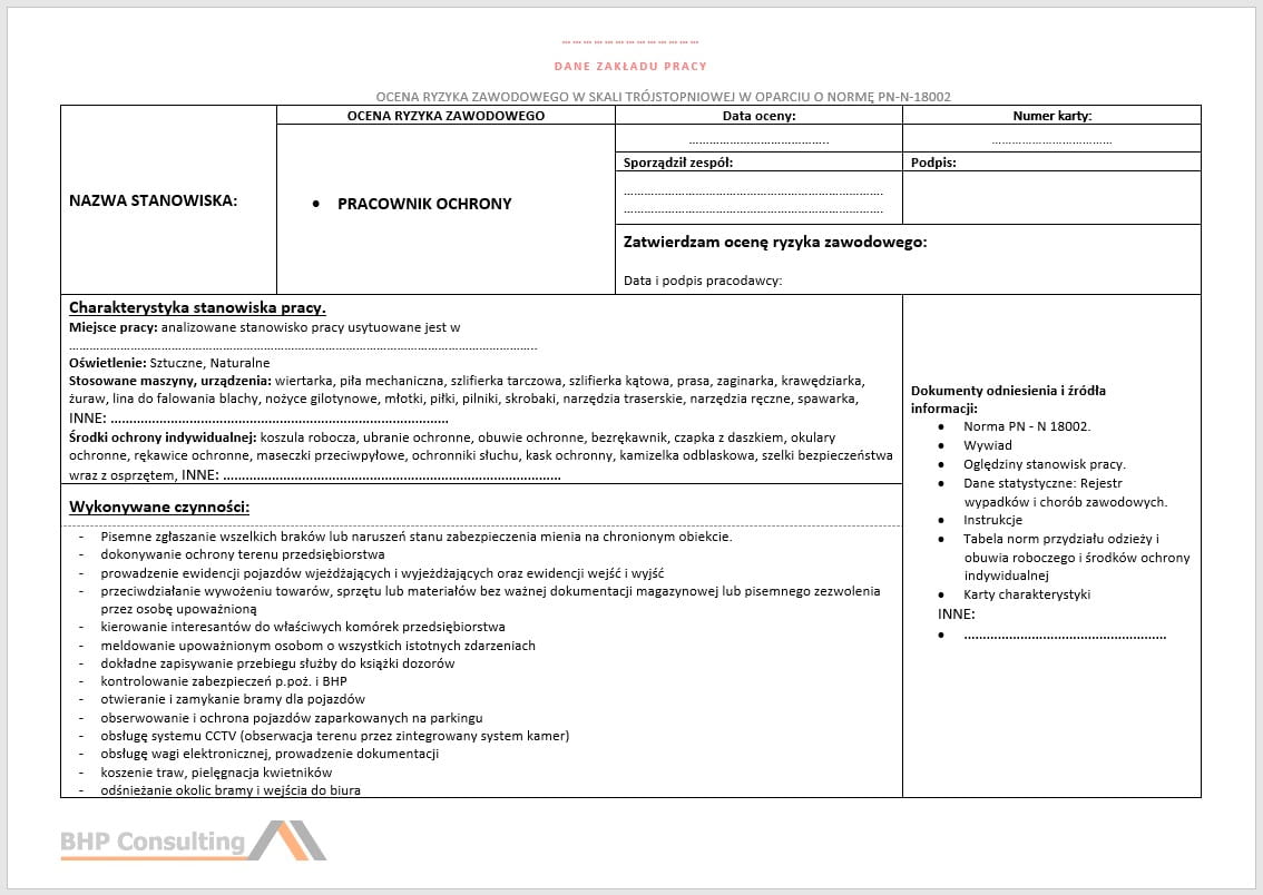 Karta oceny ryzyka zawodowego na stanowisku pracownik ochrony + możliwość konsultacji ze specjalistą ds. BHP