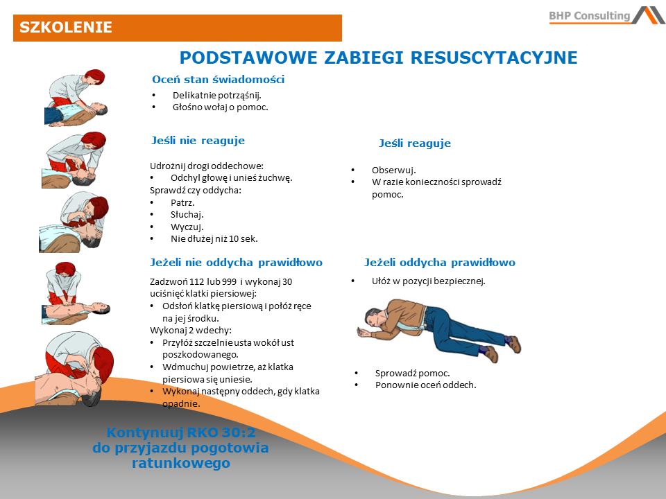 - Postępowanie w razie wypadków i w sytuacjach zagrożeń (np. pożaru, awarii), w tym zasady udzielania pierwszej pomocy w razie wypadku.