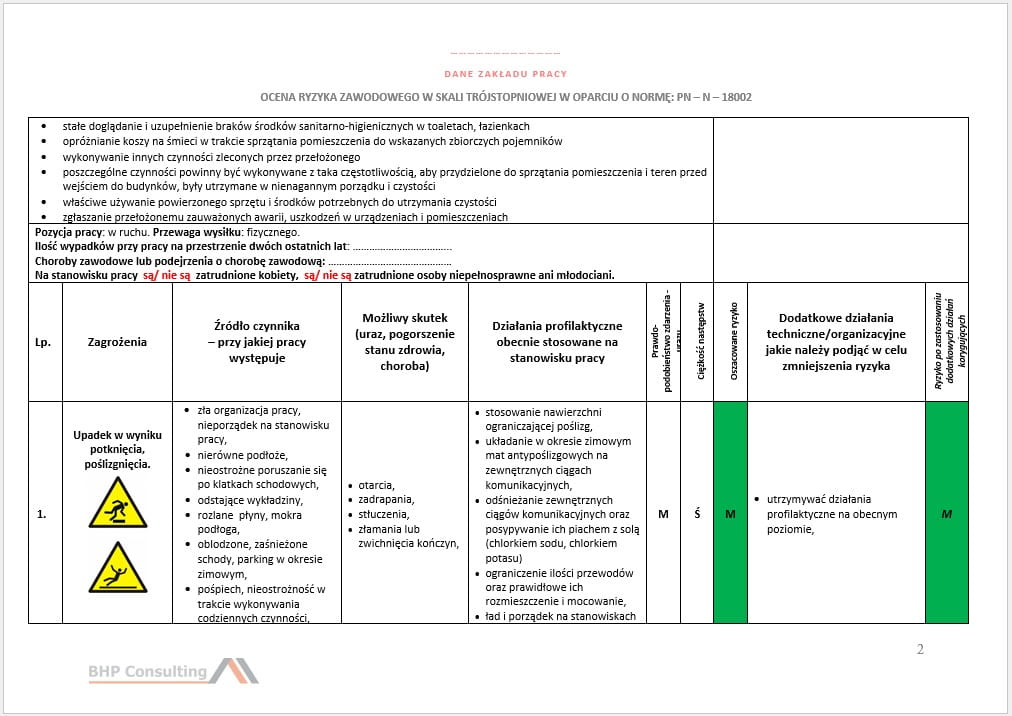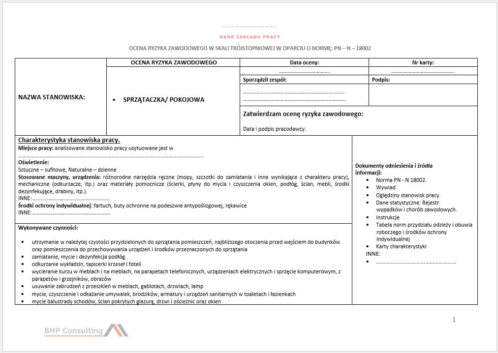 - Karta oceny ryzyka zawodowego na stanowisku sprzątaczka / pokojowa w wersji edytowalnej pliku Word