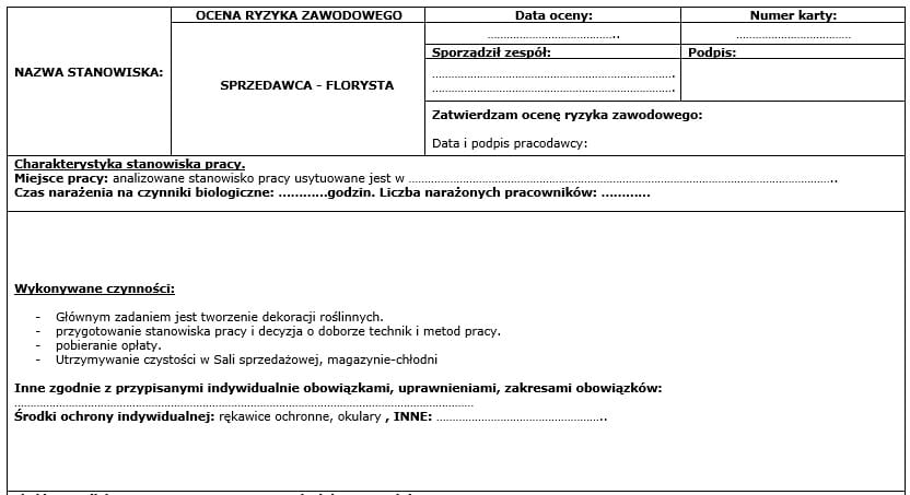 Karta oceny ryzyka zawodowego w związku z występowaniem na stanowisku pracy szkodliwych czynników biologicznych na stanowisku sprzedawca - florysta + możliwość konsultacji ze specjalistą ds. BHP + GRATIS