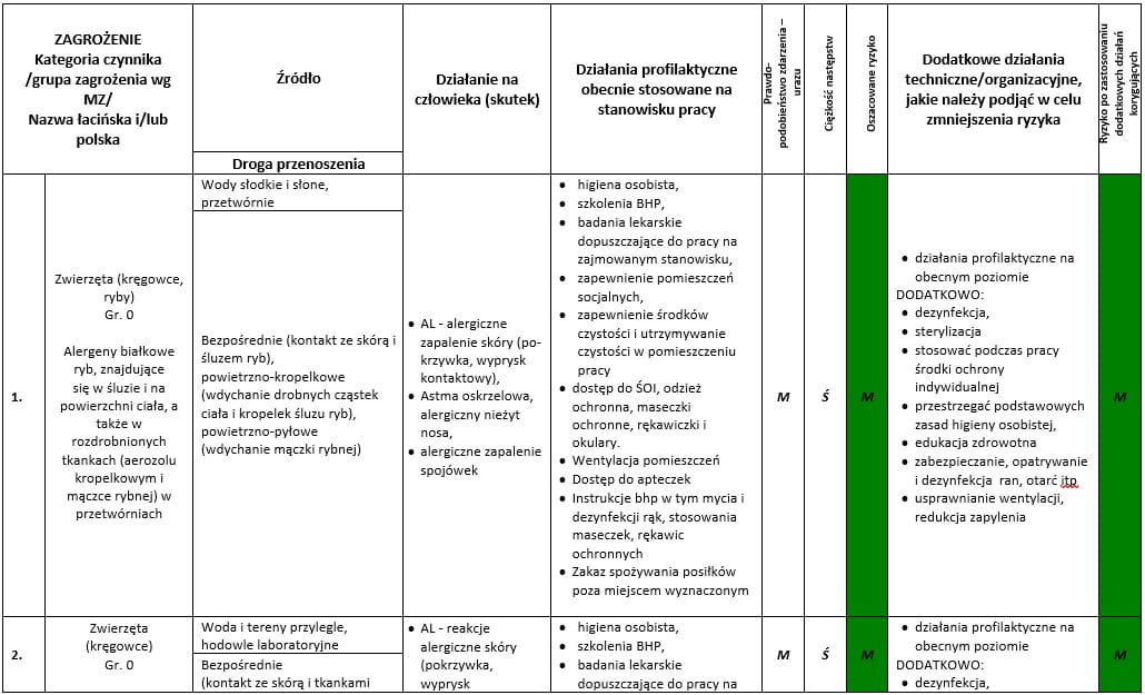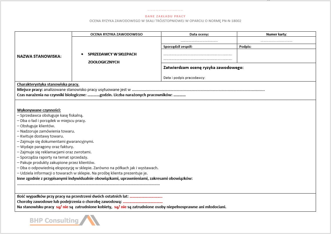 Karta oceny ryzyka zawodowego w związku z występowaniem na stanowisku pracy szkodliwych czynników biologicznych na stanowiskach sprzedawcy w sklepach zoologicznych + możliwość konsultacji ze specjalistą ds. BHP + GRATIS