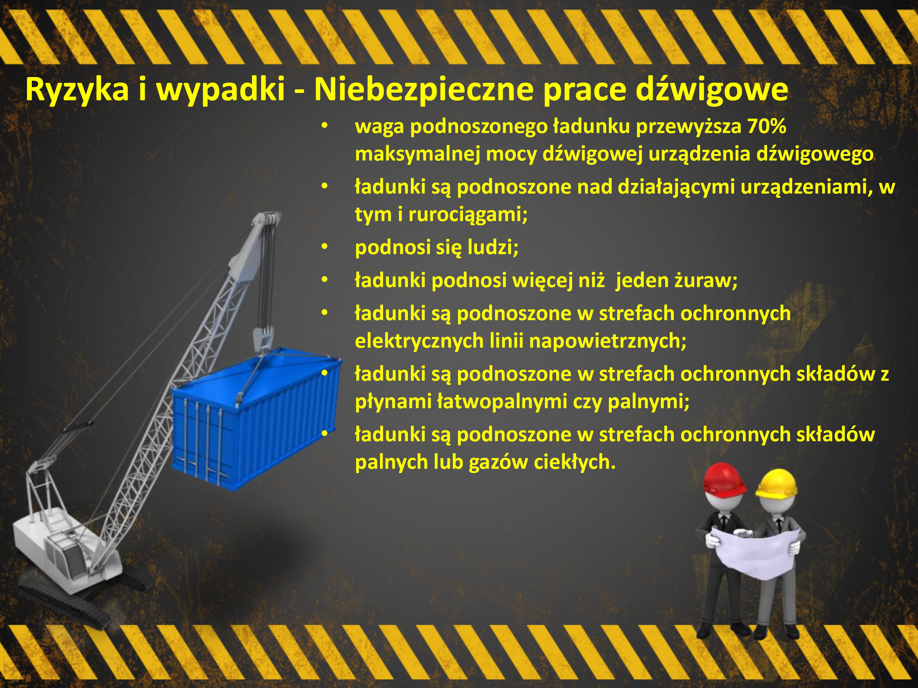 Treści zawarte w prezentacji przeznaczone są dla pracowników pełniących funkcję sygnalistów - hakowych w transporcie bliskim, a także dla operatorów żurawi, dźwigów, suwnic itp.